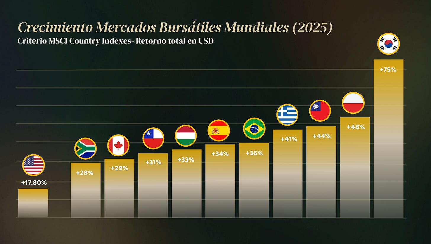 En 2025, por ejemplo, Estados Unidos tuvo un rendimiento cercano al +17.8%. No fue malo. Pero estuvo lejos de ser el mejor. Ese mismo año, economías mucho menos populares tuvieron desempeños muy superiores: Corea del Sur (+75%), Polonia (+48%), Taiwán (+44%), Grecia (+41%), Brasil (+36%).