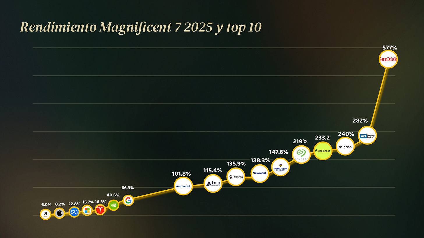 Y cuando observamos los datos, ocurre algo incómodo: los mayores rendimientos muchas veces no vienen de los nombres más grandes ni de los más obvios. En ese mismo periodo, algunas de las acciones con mejores desempeños fueron empresas mucho menos populares.