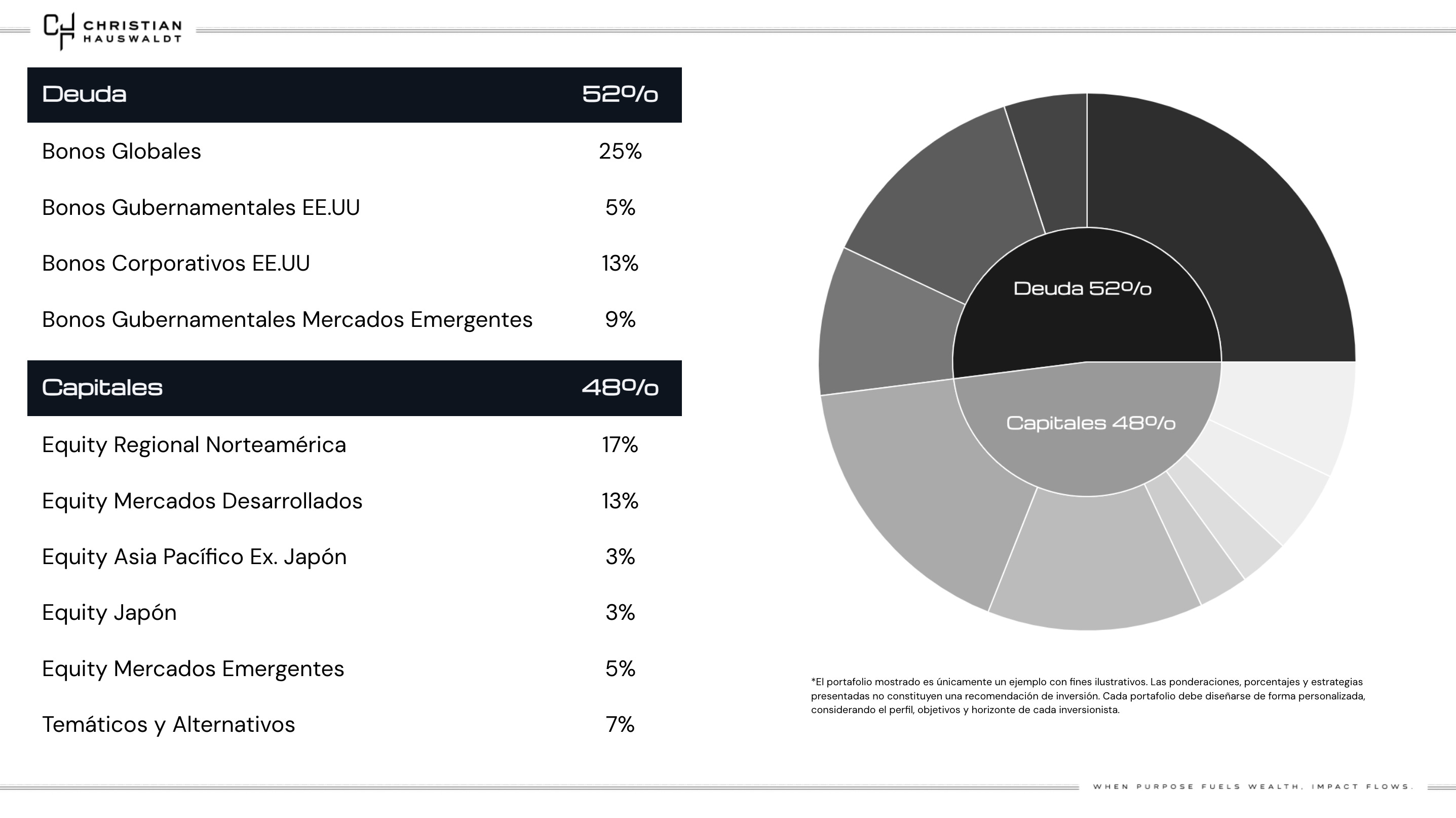 El portafolio mostrado es únicamente un ejemplo con fines ilustrativos. Las ponderaciones, porcentajes y estrategias presentadas no constituyen una recomendación de inversión. Cada portafolio debe diseñarse de forma personalizada, considerando el perfil, objetivos y horizonte de cada inversionista.